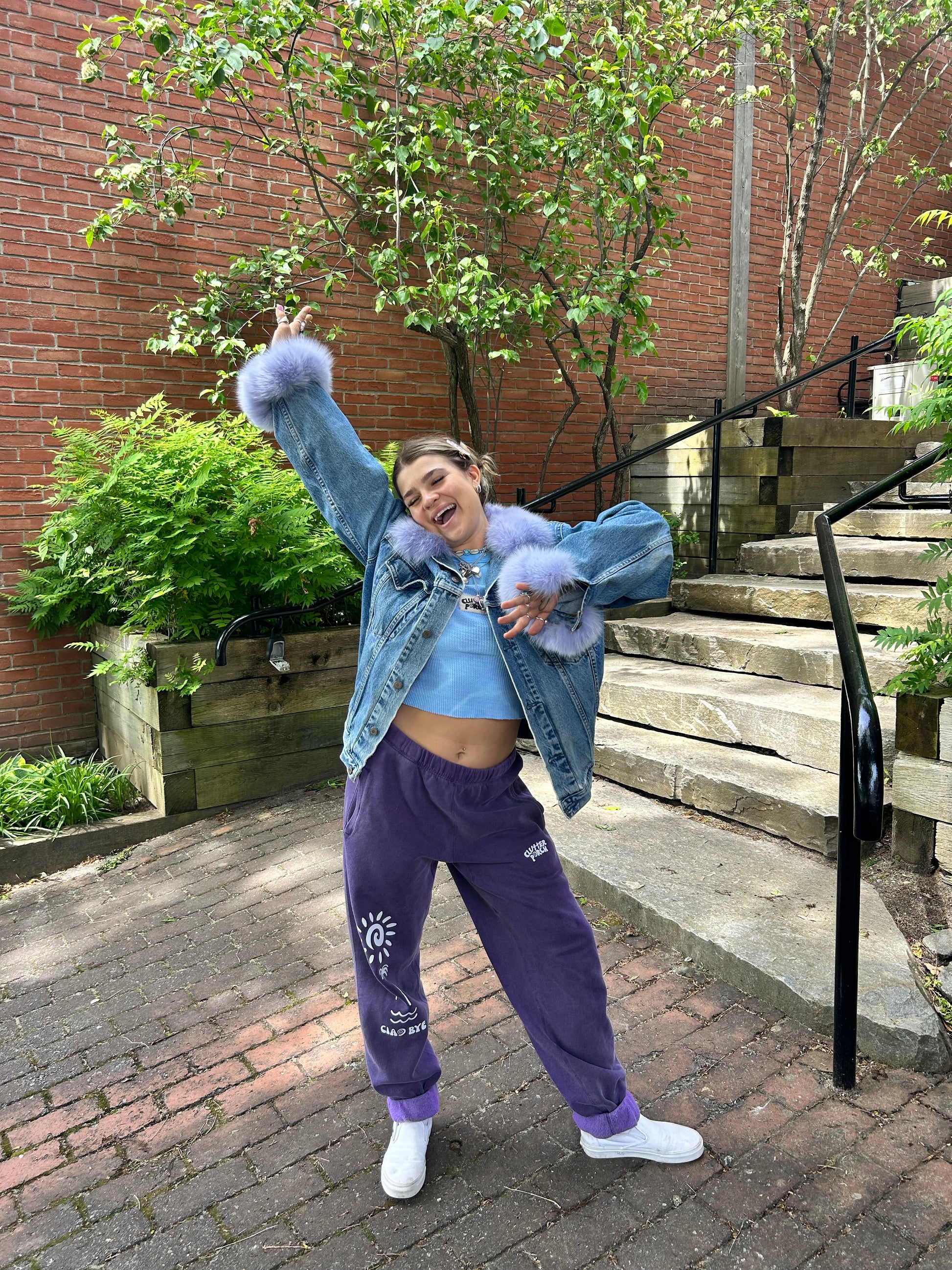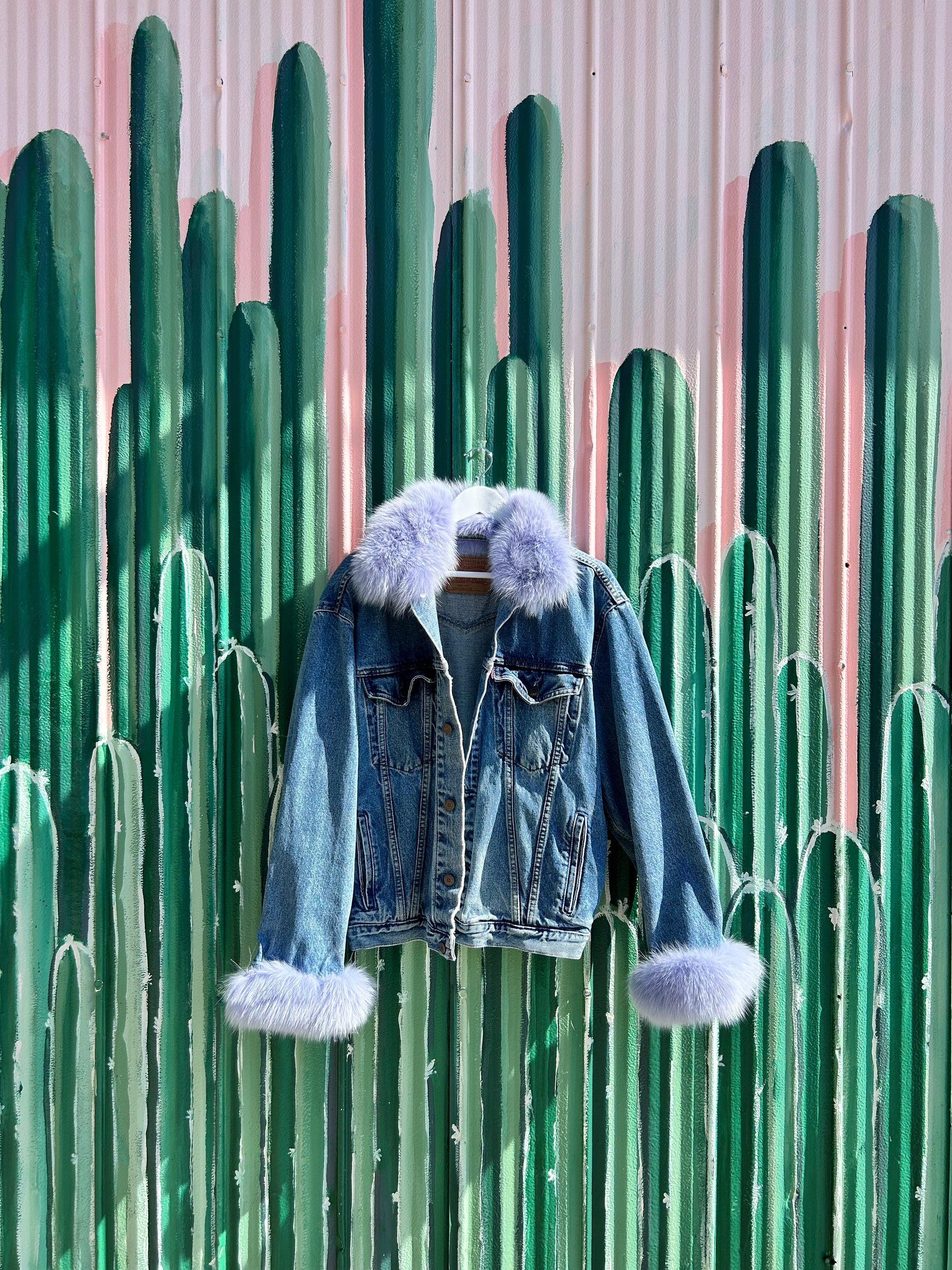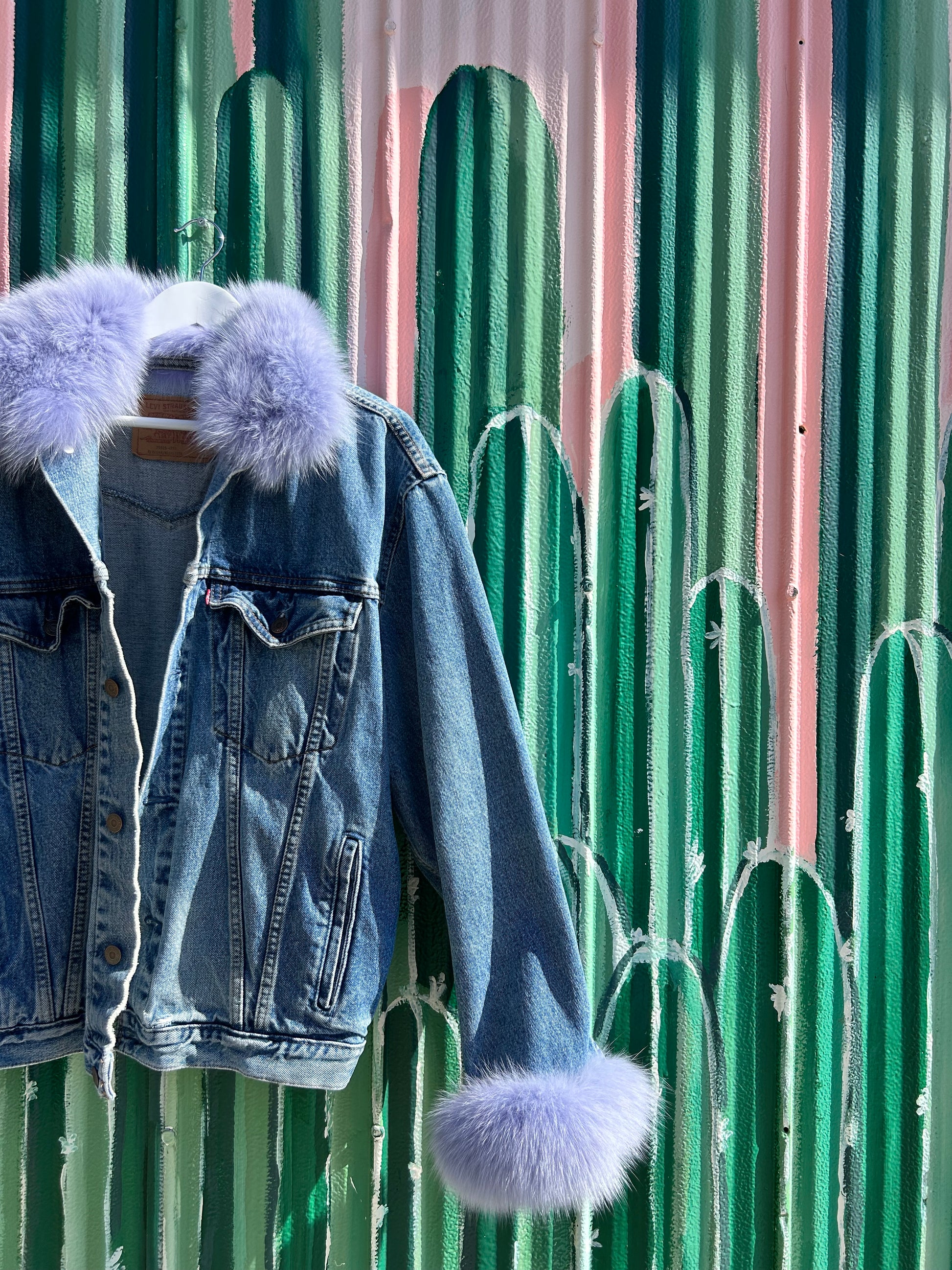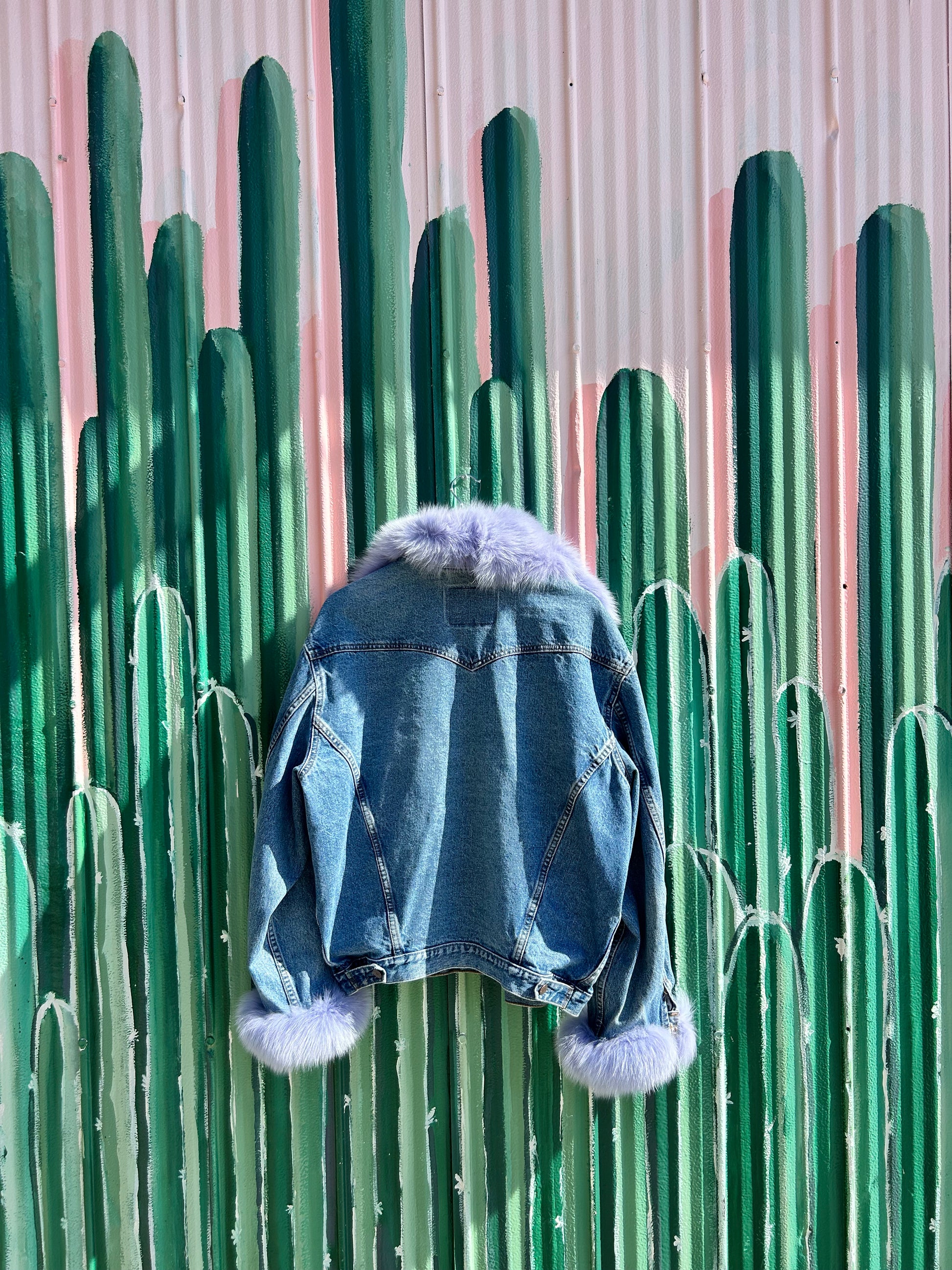 Vintage denim jacket meets recycled vintage fox fur! NO NEW FUR was used in the making of this piece. Each one is made from scraps of old vintage fur coats sent to montreal to be dyed and hand sewn onto the jacket in toronto. You won’t just turn heads in this baby … you’ll break necks <3