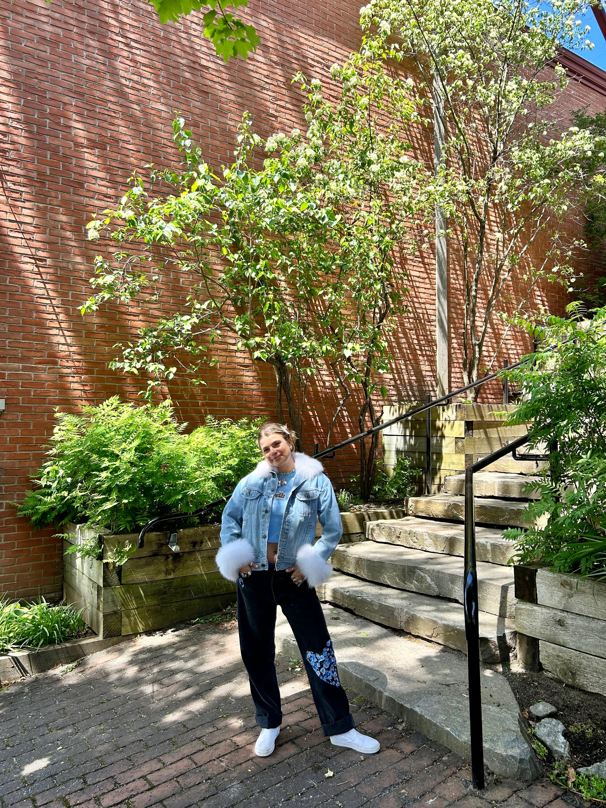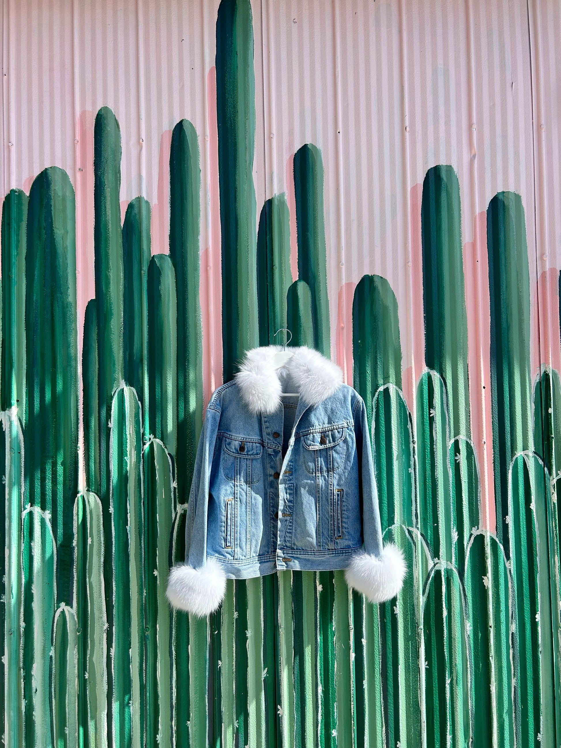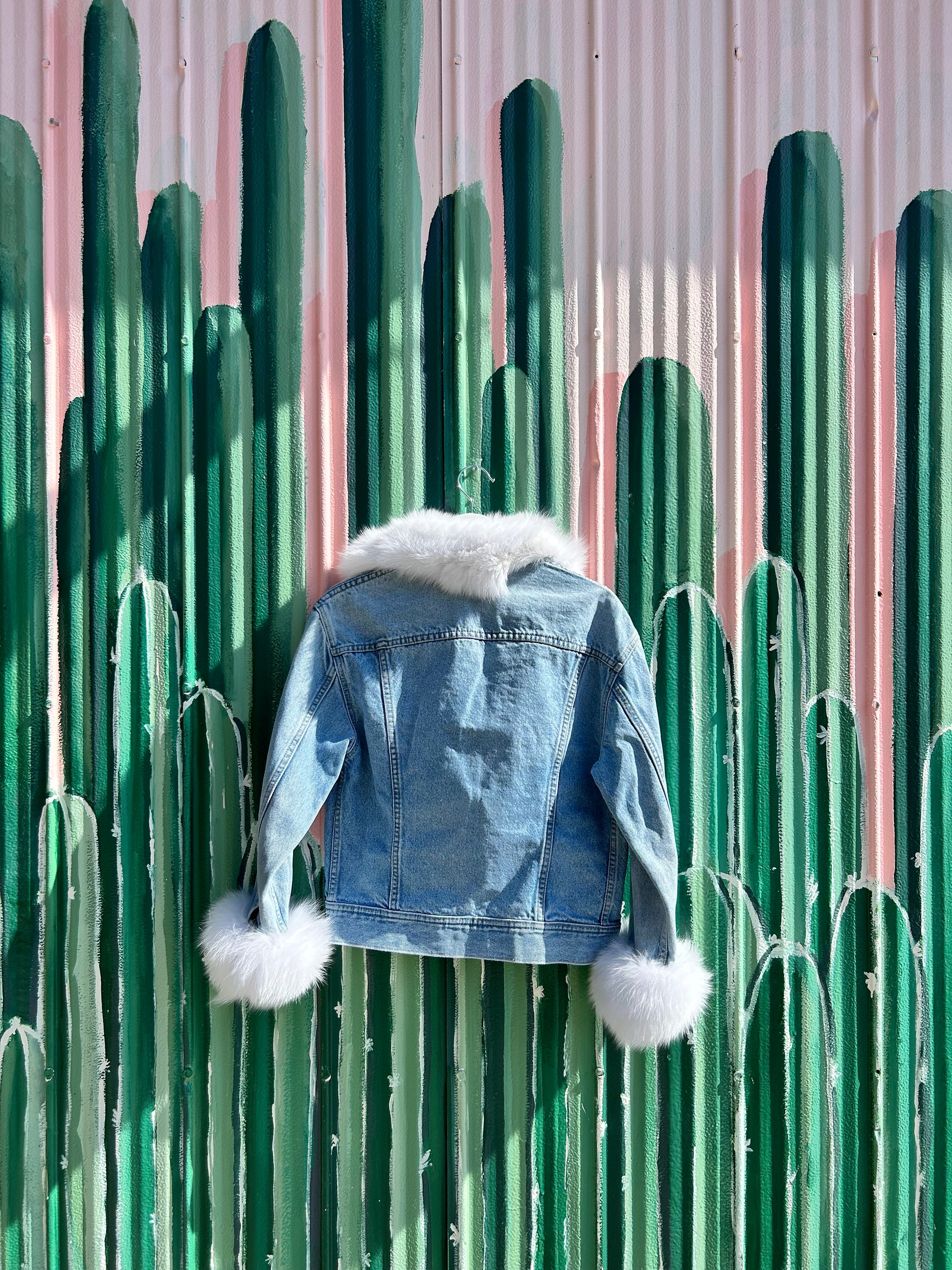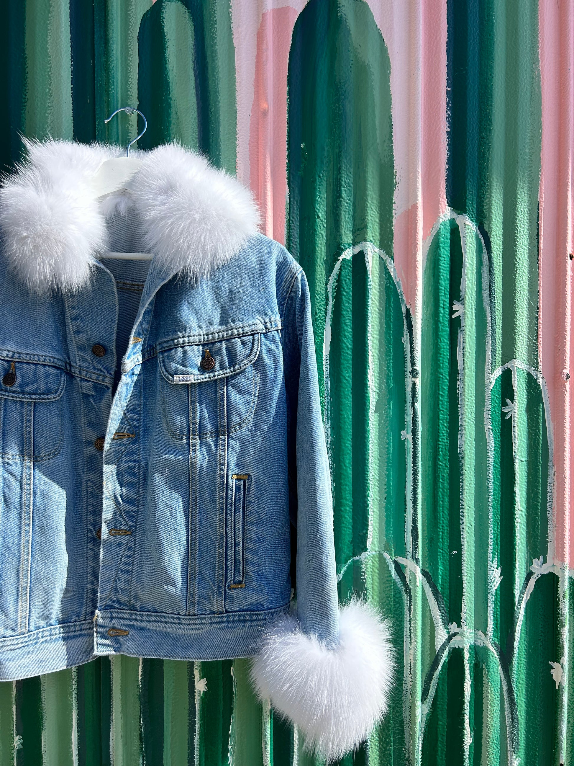 Vintage denim jacket meets recycled vintage fox fur! NO NEW FUR was used in the making of this piece. Each one is made from scraps of old vintage fur coats sent to montreal to be dyed and hand sewn onto the jacket in toronto. You won’t just turn heads in this baby … you’ll break necks <3
